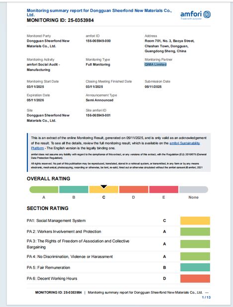 The amfori BSCI certification is a globally recognized framework that assesses a company's performance in critical areas such as worker rights, fair remuneration, occupational health and safety, and environmental protection. This endorsement signals to international partners and clients that Sheerfond New Materials operates with transparency and a deep respect for its employees and the environment.